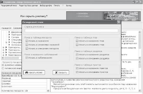 Кроме обычного поиска, программа позволяет расширенный. Для него предназначен одноименный пункт главного меню. В окне расширенного поиска можно отметить, в каких именно разделах базы данных нужно искать, а также указать область поиска – поиск можно проводить только по названию или также по содержанию разделов (рис. 5.7).