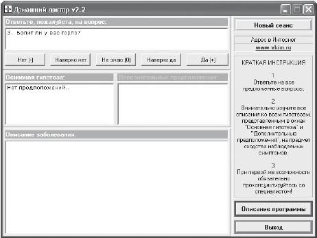Эта несложная программа позволяет поставить диагноз на основе ответов на вопросы. После запуска программы в ее окне будут появляться вопросы. Необходимо отвечать на них, выбирая один из ответов: Нет, Наверно нет, Не знаю, Наверно да, Да. Разработчики программы рекомендуют отвечать, не пропуская ни одного вопроса. В процессе ответов программа будет уточнять диагноз. В поле Основная гипотеза отобразятся возможные варианты заболевания, в поле Дополнительные предположения – менее вероятные, но также возможные варианты диагноза (рис. 5.10).