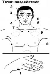 * 8 точка - сбоку под рукой примерно 10 см. ниже подмышки; * 9 точка – точка боли - 7-8 см. вниз и столько же влево (вправо) от U образного образования в основании передней части шеи.