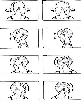 1.Сидя или лежа: а) Движение глаз вверх и вниз, из одной стороны в другую, сначала медленно, а потом быстро. Затем фиксируется взгляд на своём указательном пальце, находящемся на расстоянии 60 см, медленно подводя его на расстояние до 25 см от глаз. б) Движения головы сначала медленно, а потом быстро с открытыми и закрытыми глазами: наклоны головы вперед, назад, в стороны в разном темпе. 2.Упражнения сидя. Вращение и пожимание плечами, сгибание вперед и поднимание предметов с пола. 3.Упражнения стоя. Движения глазами, головой, плечами как в предыдущих упражнениях. Стоять с открытыми, а потом c закрытыми глазами, повернуться вокруг себя. Перебрасывание мяча с руки на руку выше уровня глаз. 4. Упражнения в движении. Ходить по комнате и обойти стул с открытыми, а потом c закрытыми глазами. Подъём и спуск по наклонной поверхности c открытыми, а потом c закрытыми глазами. Метание баскетбольного мяча на точность.