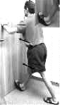Расположите ноги как показано на фото, поставьте правую ногу перед собой и левую ногу позади себя. Разместите пальцы правой стопы против двери или стены, прижав пятку к полу, упершись руками в стену. Сделайте растяжку не менее 30 секунд, а потом повторите тоже для другой стороны. Любая боль, которую Вы чувствуете с этим упражнением, должна только быть местной за счет растяжения мышцы, не ухудшая ваше состояние.