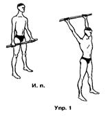 1. И.п. - стоя, ноги на ширине плеч, в руках гимнастическая палка. Прокрутить палку назад через верх, при этом руки остаются прямые. Расстояние между руками при хвате в начале выполнения комплекса больше, затем при освоении комплекса и в дальнейшем расстояние между руками должно уменьшаться. Повторять 10 раз.