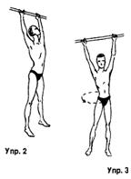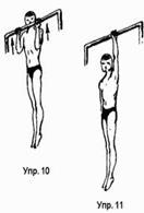 10. И.п. - взяться руками за перекладину. Подтягивать туловище к перекладине. Держа руки на ширине плеч, подтягивайтесь, стараясь коснуться перекладины подбородком. Разведя руки как можно шире, подтягивайтесь, стараясь коснуться перекладины затылком или шеей. Если Вы не умеете подтягиваться или делаете это малое количество раз, то поставьте возле турника табуретку и, помогая ногой, продолжайте подтягивания после того, как силы уже не позволяют подтягиваться одними руками. 11. И.п. - взяться одной рукой за перекладину. Повиснуть и оторвать ноги от пола, затем взяться другой рукой и оторвать ноги от пола. Висеть на одной руке 3 секунды. Эти упражнения выполняются для самовытяжения позвоночника и суставов рук.