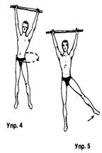 4. И.п. - стоя, ноги на ширине плеч, руки с палкой над головой, хват руками длины палки произвольный. Выполнять круговые движения туловищем по часовой стрелке, отклонение от оси не более 30°. Повторять 10 раз. 5. И.п. - стоя, ноги на ширине плеч, руки с палкой над головой. Поднять ногу в сторону и опустить ее. Упражнение выполняется как левой, так и правой ногой. Повторять 10 раз.
