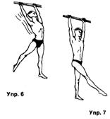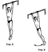8. И.п. - взяться руками за перекладину и повиснуть, оторвав ноги от пола. Висеть в течение 8-10 сек., при этом туловище расслаблено. 9. И.п. - взяться руками за перекладину и повиснуть, оторвав ноги от пола. Ритмично раскачиваться на перекладине назад и вперед.