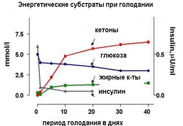 Когда запасы углеводов в печени быстро истощены и требования собственного топлива для мозга - глюкозы, должны тогда быть заменены новыми источниками выработки энергии. Кетоновые тела (ацетон, уксусная кислота и гидроксимасляная кислота), полученные в результате гидролиза жира из жирных кислот, считаются сохраненной физиологической адаптацией к длительному ограничению пищи и поддержанию адекватной мозговой функции при экономии белков.Эти кетоновые тела проходят из крови через гемоэнцефалический барьер и становятся доступными для мозгового метаболизма как основа энергии. Накапливаясь в крови, кетокислоты подавляют секрецию и специфическую активность глюкокортикоидов (гормонов надпочечников), тем самым препятствуя протеолизу, т.е. разрушению структурных белков организма. Таким образом, сдерживая протеолиз и глюконеогенез (образование глюкозы), кетокислоты сберегают структурные белки организма, подавляя активность фермента глюкагона, предотвращают чрезмерное образование и опасное накопление в крови кетоновых тел. Существенно, что уровень кетокислот в крови не превышает буферную способность крови. Это - приблизительно 10 ммоль/л.