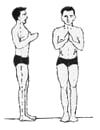 1)Вдохните и примите положение как показано на рисунке с руками, с соприкасающимися ладонями, которым присоединяются вместе около груди, ноги вместе.