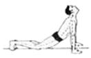 3)Вдохните и вытяните левую ногу на полу назад, прогните талию вниз и поднимите шею, грудь вперед и выдвиньте плечи назад. Держите правую ногу согнутую, и обеими вытянутыми руками опирайтесь о пол.