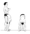 8. Подъем и опускание пяток для встряски тела и лечения всех болезней.Упражнение хорошо укрепляет всю мочеполовую систему. В первой части встаньте прямо, соедините пятки, а носки разведите под углом в 45 градусов. Делаете вдох, а на выдохе быстро наклоняетесь вперед и обхватываете руками лодыжки с боков и сзади. Ноги остаются прямыми. Задержав дыхание, выпрямляетесь, одновременно проводя руками по внешней и задней стороне ног от ступней до пояса, как бы массируя их. По окончании кладете ладони на почки. Ноги не сгибаете в коленях, а выпрямленными руками тянетесь теперь как можно дальше назад за ноги. В таком положении стойте шесть секунд, потом делаете вдох и поднимаетесь, так же, как и ранее, массируя при подъеме ноги. Снова наклоняетесь вперед, делая шумный выдох, обхватываете руками пальцы ног и начинаете тянуть их вверх, сгибая при этом руки в локтях, почти прижатых к ногам. Простояв в таком положении шесть секунд, поднимаетесь на вдохе, так же сильно проводя ладонями по ногам, начиная с задних и боковых поверхностей лодыжек до ягодиц и почек. Затем, продолжая держать ладони на почках, делаете неполный выдох, оставляя часть воздуха в легких, затем на вдохе отклоняете туловище назад, опираясь ладонями на поясницу в зоне почек. Постарайтесь отклониться как можно дальше, простояв так несколько секунд, затем начинаете медленно распрямляться, выдыхая воздух.