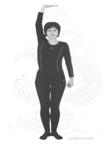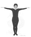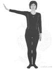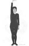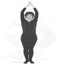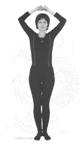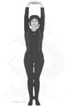 Исходная позиция: стойка, пятки вместе, носки разведены на 45 градусов, руки опущены вдоль тела. Делая вдох, поднимайте прямые руки через стороны вверх и над головой сплетите пальцы. Задержите дыхание, на паузе разворачивайте сцепленные ладони вверх, потом медленно поднимайтесь на носки, одновременно поднимите сцепленные ладони вверх как можно выше.