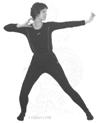 7. Сжимание кулаков и отработка свирепого взгляда. Эффект: упражнение имеет положительное воздействие на канал печени. Печень соответствует стихии дерева, и она непосредственно связана со зрением. Гневный взгляд позволяет укрепить внешний Ян и дополнить внутренний Инь. Это упражнение оказывает расслабляющее действие на печень, способствует её излечению, повышает силу ли всего тела, а так же очищению крови и Ци. Это упражнение фактически является техникой нанесения удара и предназначено для пробивания всех меридианов в организме за счет внутренней силы. Прыжком поставьте ноги врозь, на расстояние больше ширины плеч. Примите позу всадника. Слегка сжатый кулак правой руки держите у правого бока на уровне пояса, согнутый локоть отведен назад. Левая рука выпрямлена перед грудью на уровне плеча, раскрытая ладонь обращена вперед. Делая вдох, выпячиваете живот, набирая в него как можно больше воздуха. На паузе резко выбрасываете правую руку вперед, развернув кулак ладонью вниз, будто наносите удар невидимому противнику, стоящему перед вами. Левую руку синхронно рывком отводите назад, левый кулак опускаете к поясу. При этом выпрямляете ноги и стоите, устремив яростный взгляд в сторону кулака, которым наносите удар. Сделав выдох, не меняя положения рук, опять приседаете. Удар можно наносить кулаком или ладонью. Если наносите удар кулаком, то ладонью вниз. Если ладонью, то основанием ладони вперед. Удар наносится в расслабленном состоянии. Только в конечный момент вы должны напрячь руку и смотреть на предполагаемого противника сердитым, даже яростным, взглядом, смотреть именно в то место, куда наносите удар.