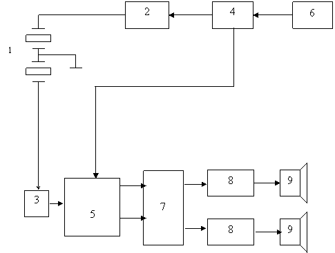 1 – УЗ датчик, 2 – УМ, 3 – предварительный усилитель, 4 – задающий генератор, 5 – синхронный детектор и схема формирования квадратурных сигналов, 6 – кварцевый резонатор, 7 – полосовой фильтр и схема выделения сигналов прямого и обратного кровотока, 8 – УНЧ, 9 – громкоговорители.