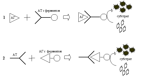Метод основан на специфическом связывании антитела с антигеном, при этом один из компонентов конъюгирован с ферментом, в результатереакции с соответствующим хромогенным субстратом образовывается окрашенный продукт, количество которого можно определить спектрофотометрически (рис. 1).
