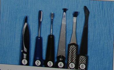 1 – скальпель для использования сломанного лезвия; 2 – серповидный; 3 – минм-серповидный; 4 – ложковидный 260°; 5 – чешуевидный; 6 – глазной