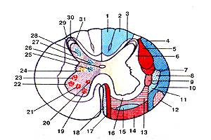 1; 2-тонкий и клиновидный пучки; 3-собственный (задний) пучок; 4-залний спипно-мозжечковый путь; 5-латеральный пирамидный (корково-спинномозговой) путь; 6-собствепный пучок (латеральный); 7-красноядерно-спинномозговой путь; 8-лате-ральный спинно-таламический путь; 9-задний преддверно-спин-номозговой путь; 10-передний спинно-мозжечковый путь; 12-оливо-спинномозговой путь; 13-ретикуло-спинно-мозговой путь; 14-иреддверно-спинномозговой путь; 15-нередний спинно-таламический путь; 16-собственный пучок (передний); 17-перед-ний пирамидный (корково-спинномозговой) путь; 18-покрышеч-но-спинномозговой путь; 19-переднемедиальное ядро; 20-задне-медиадьное ядро; 21-центральное ядро; 22-передне-латеральное ядро; 23-задне-латералыюе ядро; 24-промежуточно-да-теральнос ядро; 25-промежуточное ядро; 26-не игральны и капал; 27-грудное ядро; 28-СОбсгвенное ядро (BNA): 29-пограничная зона (BNA); 30-губчатый слой; 31-студенистое вещество.