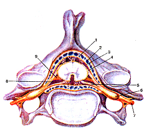 1-твёрдая оболочка спинного мозга; 2-эпидуральное пространство; 3-паутинная оболочка; 4-задний корешок спинномозговой нерва: 5-передний корешок; 6-спинномозговой узел; 7-спинно мозговой нерв; 8-подпаутинное (субарахноидальное) пространство; 9-зубчатая связка. Снаружи спинной мозг окружен тремя оболочками. Наружная - твердая оболочка спинного мозга фиксирована связочным аппаратом в позвоночном канале и отделена от надкостницы этого канала эпиндуальным пространством, заполненным жировой клетчаткой и венозным сплетением, средняя - тонкая, прозрачная, называется паутинной оболочкой спинного мозга; внутрення тесно прилегает к спинному мозгу и содержит кровеносные сосуды, питающие его, - это мягкая оболочка спинного мозга.
