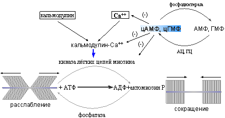 Молекулы цАМФ и цГМФ понижают содержание ионов кальция в цитоплазме. Фосфодиэстераза катализирует распад циклических цАМФ и цГМФ до неактивных форм (АМФ и ГМФ). Таким образом, одним из условий, необходимых для сокращения, является высокая активность фосфодиэстеразы, а для того, чтобы достигалось расслабление – наоборот, низкая активность фосфодиэстеразы.