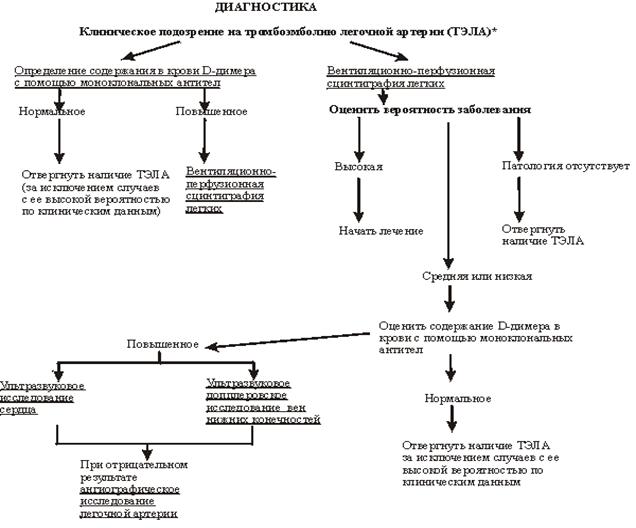 В диагностике ТЭЛА лабораторные исследования имеют вспомогательное значение. При массивной эмболии отмечаются гипокапния и дыхательный алкалоз. У больных с ТЭЛА, осложнившейся развитием инфаркта легких, наблюдается умеренная гипербилирубинемия. Активность аминотрансфераз сыворотки и креатинфосфокиназы не меняется, что имеет значение для дифференциальной диагностики легочных эмболий и инфаркта миокарда. При развитии инфаркта легкого могут наблюдаться лейкоцитоз и ускорение СОЭ. Наиболее специфичны и корригируют с тяжестью легочной эмболии остро возникшие изменения на ЭКГ, отражающие поворот оси сердца по часовой стрелке и отчасти ишемию миокарда: появление зубца QIII и инверсия зубца TIII, иногда в сочетании с выраженным зубцом QаVF и отрицательным зубцом TII, инверсия зубцов Т в правых грудных отведениях - от VI до V4, а также появление глубокого зубца S1 и углубление зубцов S в левых грудных отведениях. Может развиваться блокада правой ножки пучка Гиса, иногда сопровождающаяся трепетанием или мерцанием предсердий Признаки острой перегрузки правого желудочка достоверно чаще наблюдаются при эмболии ствола и главных ветвей легочной артерии, чем при поражении долевых и сегментарных ветвей. Диагностическая значимость изменений на ЭКГ возрастает при их сопоставлении с данными анамнеза, физикального обследования и результатами исследования активности кардиоспецифических ферментов. Рентгенологические признаки ТЭЛА малоспецифичны. Наиболее характерны симптомы острого легочного сердца: расширение верхней полой вены, тени сердца вправо и выбухание конуса легочной артерии. Расширение конуса легочной артерии проявляется сглаживанием талии сердца или выбуханием второй дуги за левый контур. Могут наблюдаться расширение корня легкого, его обрубленность и деформация на стороне поражения. При эмболии в одну из главных ветвей легочной артерии, в долевые или сегментарные ветви при отсутствии фоновой бронхолегочной патологии может наблюдаться обеднение ("просветление") легочного рисунка (симптом Вестермарка).